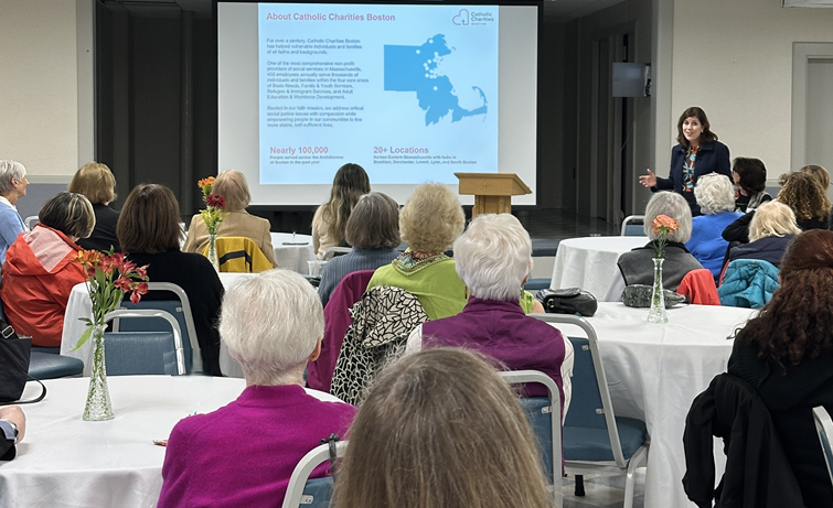 Kelley, a long-time St. John parishioner, shared the history of Catholic Charities, which began in 1903 in response to the appalling social conditions of Boston’s immigrant and predominantly Catholic population. Today, Catholic Charities Boston is one of the most comprehensive social service non-profit organizations in Massachusetts, with programs across 20+ locations serving neighbors of all faiths and backgrounds that help move people from crisis to self-sufficiency. Programs include shelters and food assistance, youth and family services, child care and summer programs, refugee and immigrant services, adult education, English language classes, and job training.