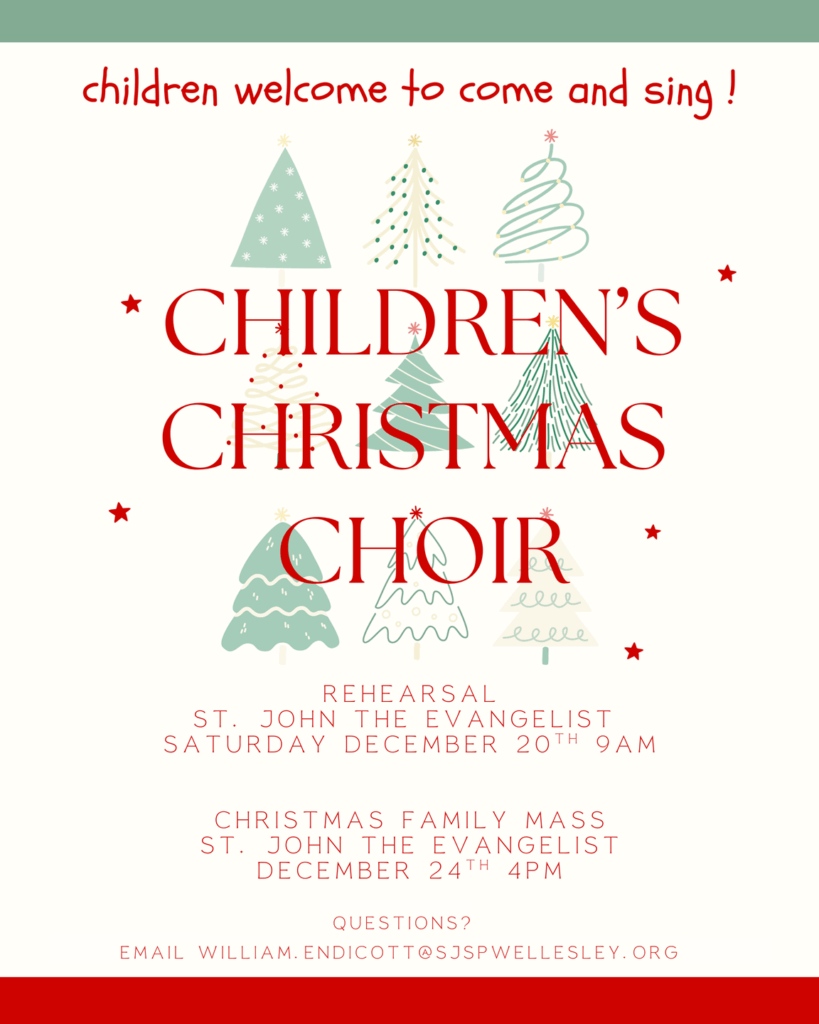 To learn more, ask questions, or express interest for your child, please speak to William Endicott, Music Director after Mass or email him at william.endicott@sjspwellesley.org.