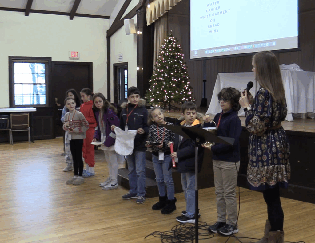 During the “Focus on Faith” reflection at the beginning of the session, we talked about what a sacrament is and what is meant by “sacramental grace.” The children learned that a sacrament is something we can see that is a symbol of something we can’t see, and that sacramental grace is a love that we can’t earn – it’s something given to you, as a gift. We talked about and looked at some of the visible symbols of sacraments, including water, oil, bread, and wine.